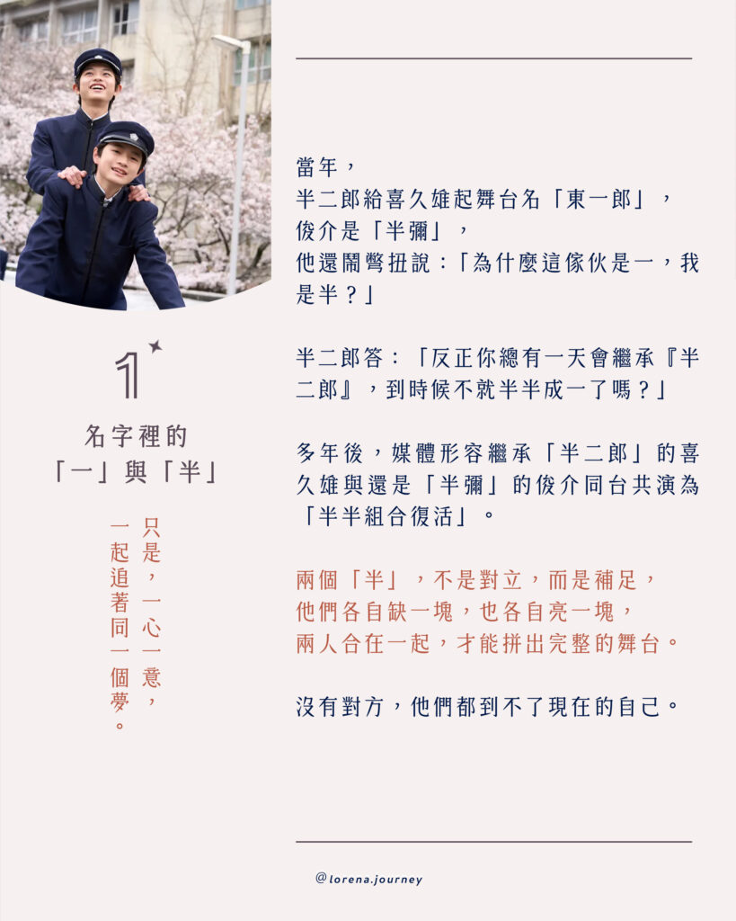 當年喜久雄來到丹波屋門下,半二郎給他的舞台名是「東一郎」,而俊介是「半彌」。青少年的俊介還鬧彆扭地說:「為什麼這傢伙是一,我是半?」