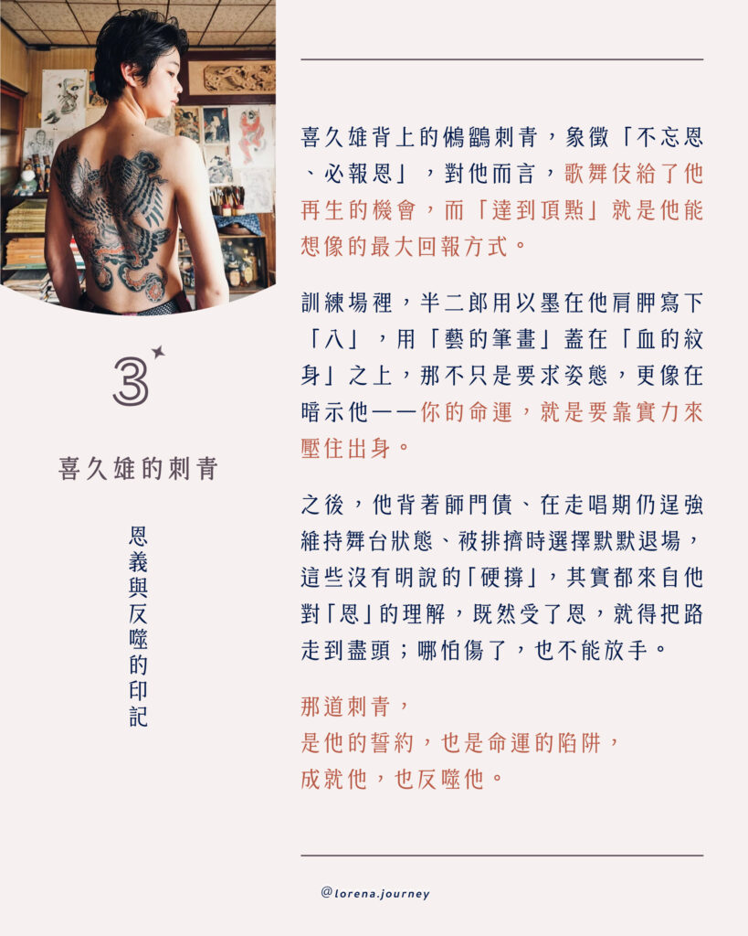 喜久雄背上的鵂鶹(貓頭鷹)刺青,象徵「不忘恩、必報恩」。對他而言,歌舞伎予他新生,他便以「抵達頂點」作為餘生的還願。訓練場上,半二郎以墨在喜久雄肩胛寫下「八」字,像是企圖以藝道的筆畫,鎮壓住那血色的紋身,那不只是要求姿態,更像在暗示他——你的命運,就是要靠實力來壓住出身。