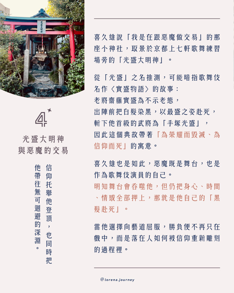 喜久雄說「我是在跟惡魔做交易」的那座小神社,取景於京都上七軒歌舞練習場一旁的「光盛大明神」。雖然正式祭神不明,但從「光盛」之名推測,可能暗指歌舞伎名作〈實盛物語〉的故事: