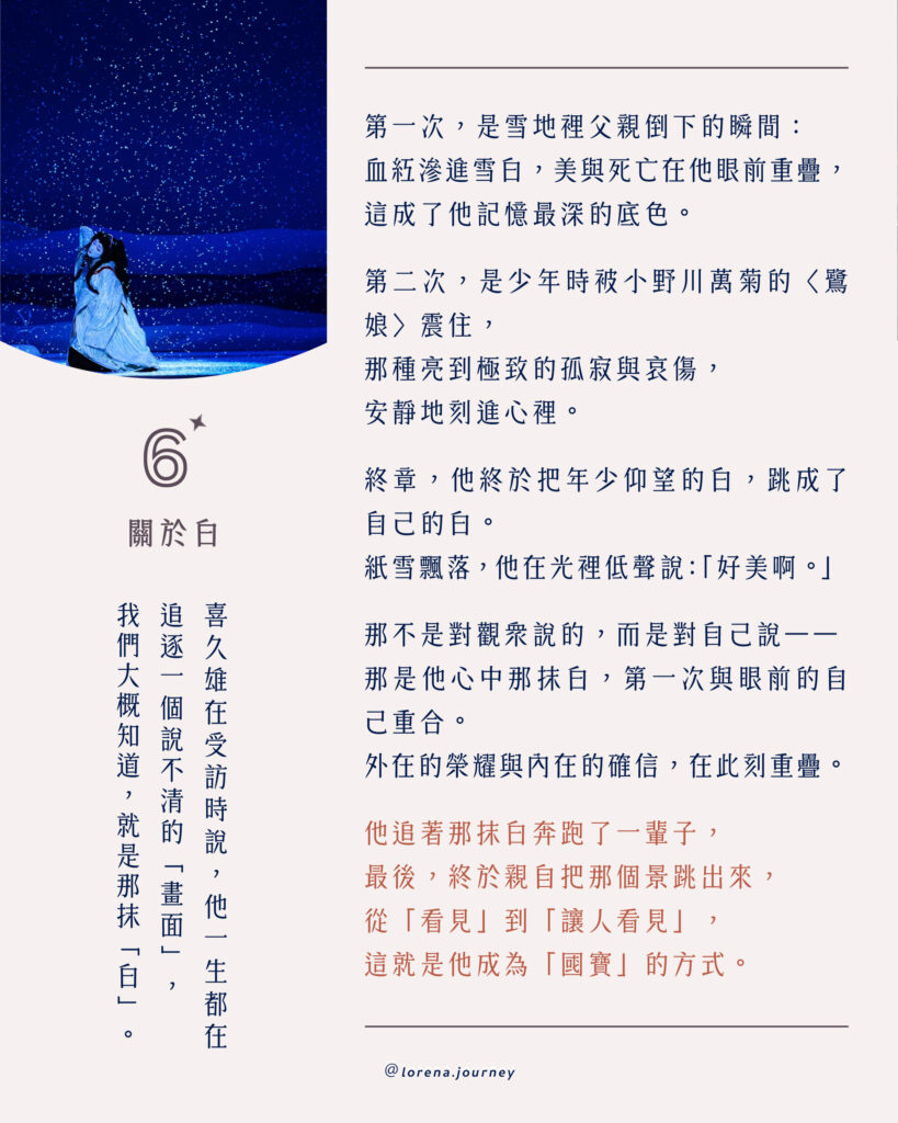 那是童年雪地裡父親倒下的鮮紅與雪白;是少年時仰望前輩—小野川萬菊演出〈鷺娘〉時,那種亮到極致的哀傷。最終,他在紙雪中翩然起舞,那句「好美啊」輕如嘆息,那是他追逐了一輩子,終於與心中那抹白重疊的瞬間。