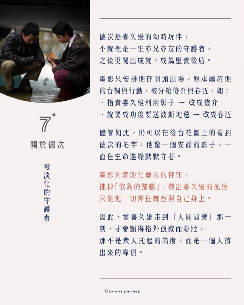 在原作中,玩伴德次是喜久雄現實生活的支柱,然而電影刻意淡化了他的存在,將喜久雄推向更極端的境地。儘管如此,電影仍留下細微的痕跡,後台花籃上的署名,仍然可以看到「德次」的名字,像是一個默默在邊緣守望的影子。