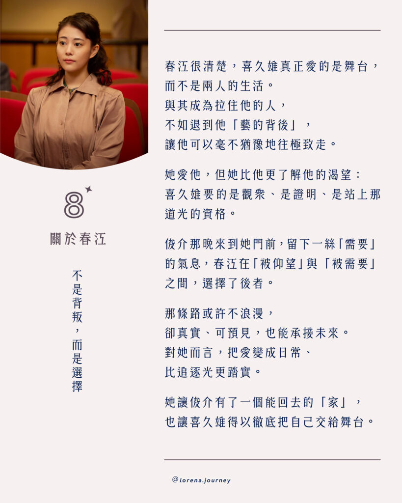 俊介那晚來到她門前,留下一絲「需要」的氣息,春江選擇走向俊介,並非背叛,而是選擇了一種能被承接的未來。